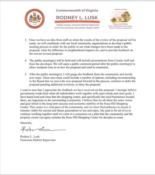 We suggest that any redevelopment of the center remain generally in line with Fairfax County’s adopted Comprehensive Plan for our area. We oppose the Site-Specific Plan Amendment process being used to circumvent the adopted plan and judge the project in a vacuum, disregarding the adjacent communities. We have said that since the beginning.