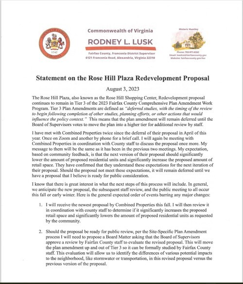 We now have a definitive statement from Supervisor Rodney Lusk (included below) on his position on the proposal and the process and a promise from Combined to provide a new proposal by the end of the year.